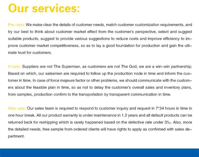 2 Unser Unternehmen garantiert 7 * 16 Stunden Service, beantwortet schnell auf Kundenfragen und individuelle Bedürfnisse innerhalb von 12 Stunden, die wir nach Fotos, Mustern oder CAD produzieren konnten